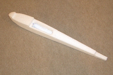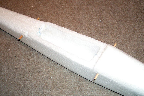 Die beiden Rumpfhälften werden vor dem Verkleben für die Aufnahme der RC-Komponenten innen ausgehöhlt (Heißdraht, mit Messer schneiden oder ausfräsen). Ins Heck wird innen zur Stabilisierung ein halbes Schaschlikstäbchen eingeklebt.
