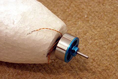Für die Motorhalterung wird ein 8er Carbonrohr (Innendurchmesser = 6mm) etwa 2 cm tief in den Rumpf geklebt. Das in den Rumpf gesteckte Carbonrohr einfach überstehen lassen => so lässt sich leicht ein Motorsturz von ca. 2° nach unten und ein Seitenzug von ca. 1° nach rechts einstellen. Dann dünnflüssigen Sekundenkleber hineinlaufen lassen und wenn fest, den überstehenden Teil abschneiden (Laubsäge, Dremle-Flex...).