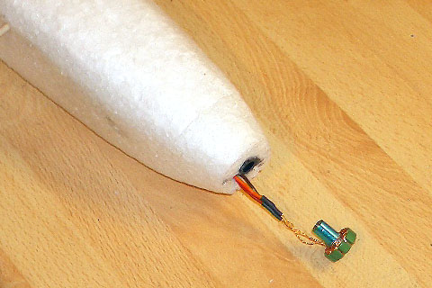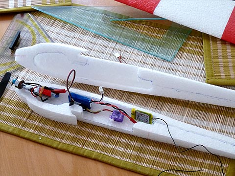 Die Motorkabel werden aus Platz- und Gewichtsgründen direkt auf oder mit dem Regler verlötet (Schrumpfschlauch drüber, damits keinen Kurzschluss geben kann). Platzmäßig wird der Regler vorne im ausgehöhlten Rumpf "verstaut". Hinten kommt der Empfänger rein - die Antenne geht sofort nach oben raus und wird zum Seitenleitwerk abgespannt. Dazu ein kleines Stück Bowdenzugrohr (3mm) durch den Rumpf zum Empfänger und hinten oben am Seitenleitwerk ankleben.