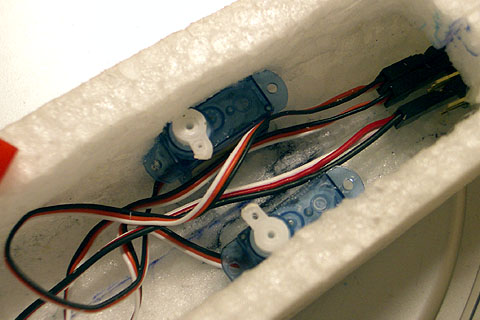Einbau der Servos: in diesem Fall haben wir uns für Höhen- und Seitenruder entschieden, da der Flieger noch Räder für Bodenstart bekommen soll. Wer auf Bodenstarts mit Räder verzichtet, baut lieber Querruder ein und kann damit Rollen fliegen. Die 3,7g-Servos sitzen links und rechts unter der Fläche. Mit dickflüssigem Sekundenkleber (der nicht ins Servo reinläuft und dort die Zahnräder verklebt) festkleben.