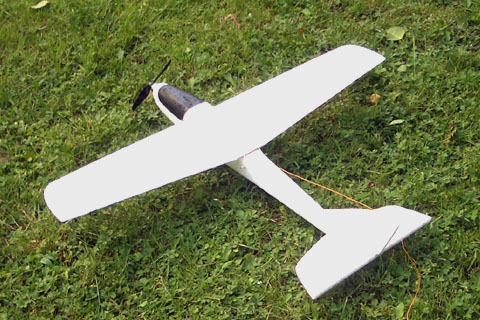 FLächenbau: in die Flächenhälften ein 4er Carbonrohr (Schlitz schneiden) einkleben. Öhrchen mit UHUpor an die Flächenhälften kleben und verschleifen. Dann die Flächenhälften mit einer V-Stellung von ~2° pro Seite (4~5° in der Summe) zusammenkleben. Die Flächenmitte mit einem Reststück des 4er Carbonrohres ein oder zweimal überbrücken. Soll die Fläche abnehmbar und mit Gummi aufgespannt werden, empfiehlt es sich, die Fläche an Nase und Endleiste mit einem Stück Schaschlikstäbchen od ähnl. zusätzlich zu überbrücken (damit sie der Gummizug nicht verbiegt bzw. schneidet).