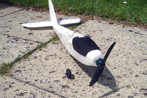 Der Antrieb: ein 10g-Brushless-Motor (z.B. 1811-2000), Mitnehmer und 5043-GWS-Prop (5x4,3). TIPP 1: GWS-Props haben ein 3mm-Loch, Mitnehmer oft 4mm. Dazu den GWS-Prop einfach an der Rückseite mit einem 5er Bohrer etwas ansenken und schon passts (nicht durchbohren - das "eiert" hernach meist). TIPP 2: GWS-Props haben einen sehr guten Wirkunsggrad, brechen aber leider sehr schnell ab! Deshalb die Prop-Blätter erstmal mit einem Tropfen 5-Min-Epoxy an ihrer Wurzel (Vorder- und Rückseite) verstärken und dann hält auch das weit besser.