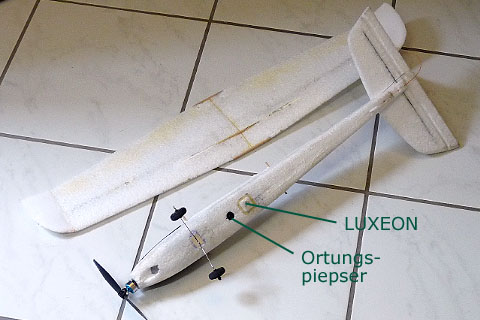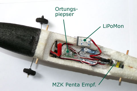 Ein Ortungspiepser (weil er mal ins Feld plumpste und fast nicht mehr zu finden war) und einen Lipo-Wächter, der die Einzelzellen prüft und rechtzeitig meldet, bevor der Akku leer ist (damit er nicht wieder ins Feld plumpst).