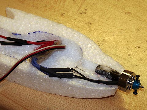 Wie beim Prototypen steckt der 10g-Motor in einem 8er-Carbonrohr. Dieses wird in eine ausgefräste Rinne mit etwa 1-2° Neigung zur Rumpfachse (= Motorsturz) geklebt.