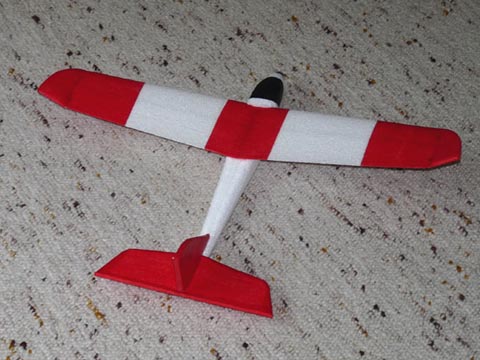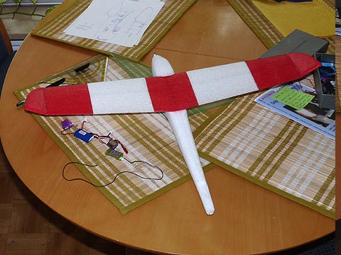 In die Fläche wurde diesmal gleich von unten ein 4er Carbonrohr geklebt - die Festigkeit ist damit nochmal einen Tick besser, als beim Prototypen. Das rot ist übrigens nicht lackiert, sondern ein dünnes vorgefärbtes Bastelpapier, mit einer Ponal-Wasser-Mischung aufgeklebt (ja - es hält auf EPP und verfestigt die Depron-Öhrchen optimal).