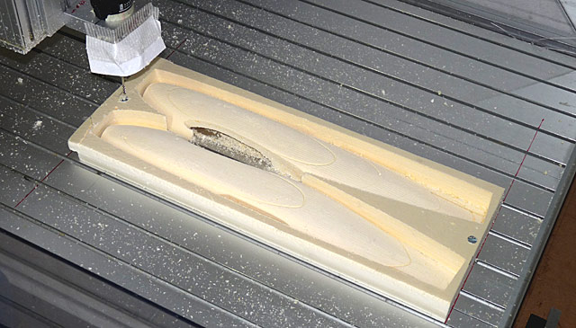 Der zu fräsende Styrodurblock wird um die Rumpfhälften gelegt und das Schurpp-Programm erzeugt (abtragen des überschüssigen Styrodurs in Stufen)