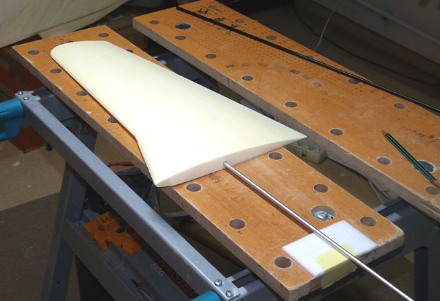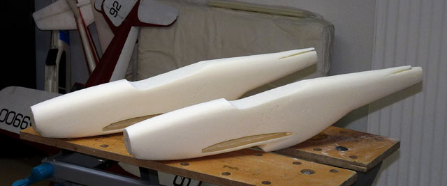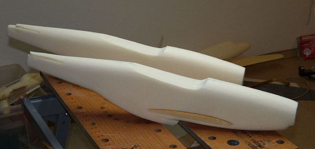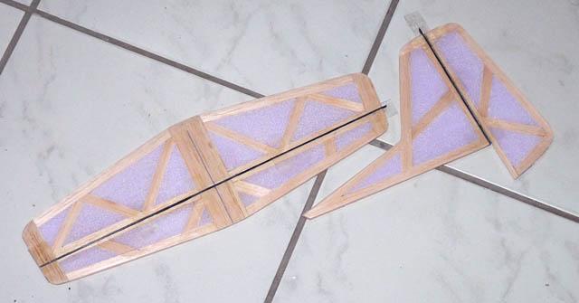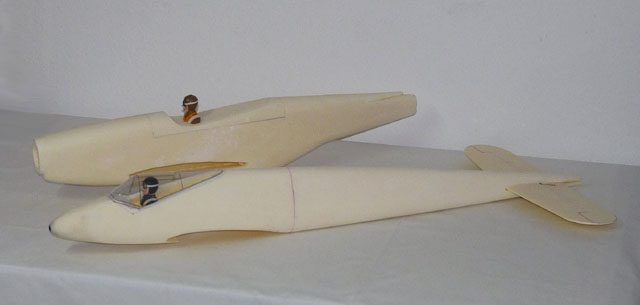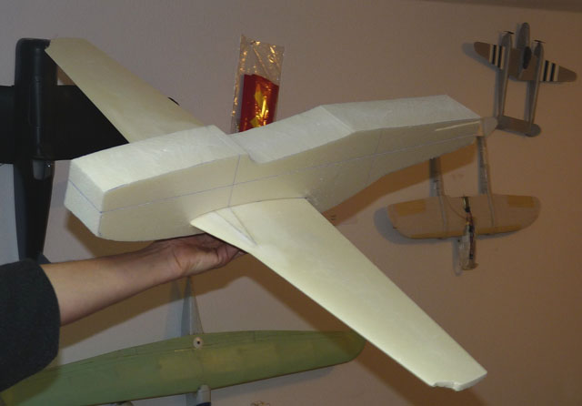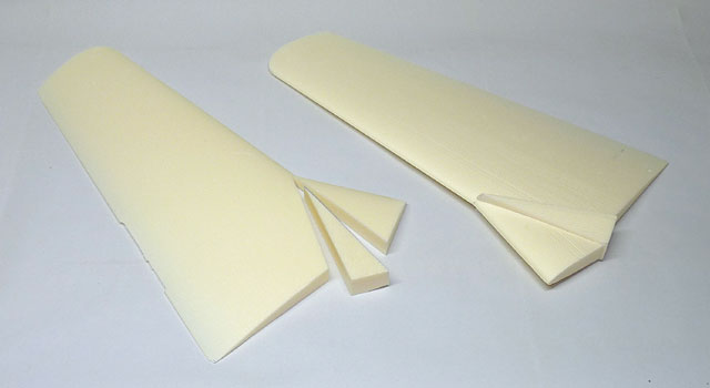Die Flächen wurden gerade geschnitten und die Pfeilung in der Flächenmitte durch Einfügen entsprechender Keile gemacht. Vorteil: die Fläche besteht nur aus 2 Teilen und sie lässt sich leichter Schneiden. Nachteil: die Profiltreue geht etwas verloren - bei dieser Größe aber zu verschmerzen.