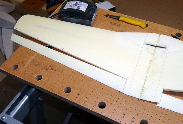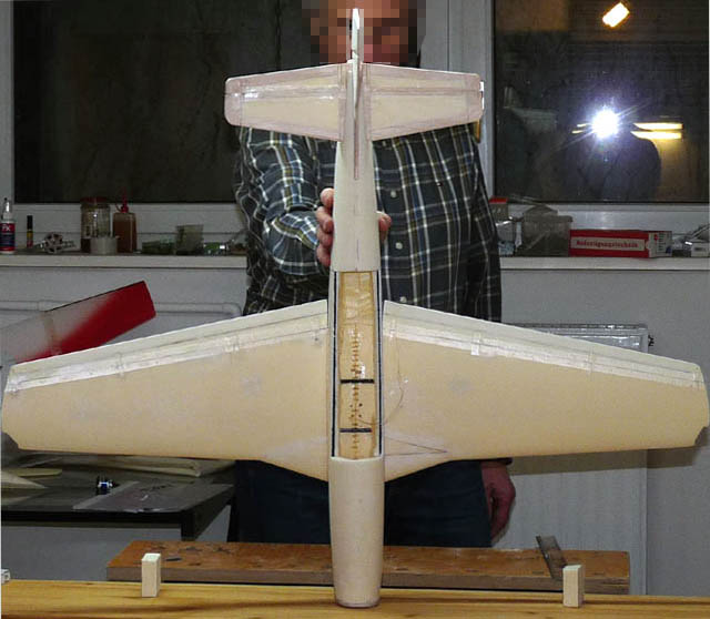 Der Stoß ist auf der Oberseite zusätzlich mit kleinen Carbonröhrchen verstärkt (mit Ponal einleimen). Beim Verleimen der beiden Flächenhälften den V-Winkel von ca. 5° durch entsprechendes Unterlegen der Randbögen einstellen. Die QR werden an den markierten Stellen mit ca. 7mm breiten Streifen einer Overhead-Transparentfolie und UHUpor angeklebt. Der Spalt wird anschließend mit einem matten Tesastreifen überklebt (für bessere Haftung zuvor die Styrodurseite mit UHUpor einstreichen).