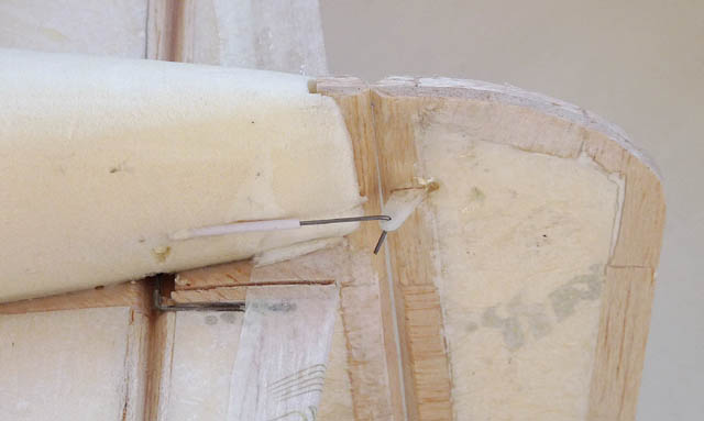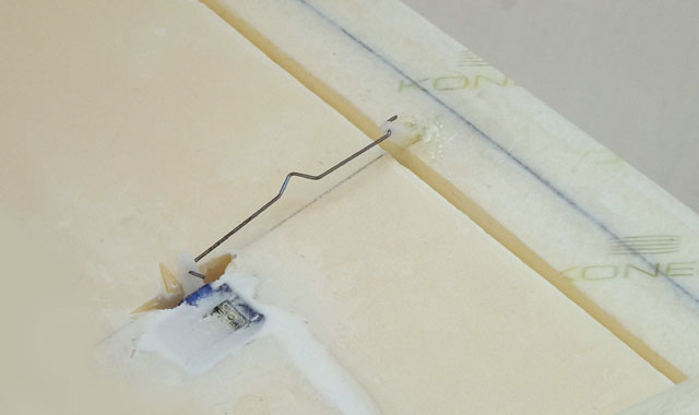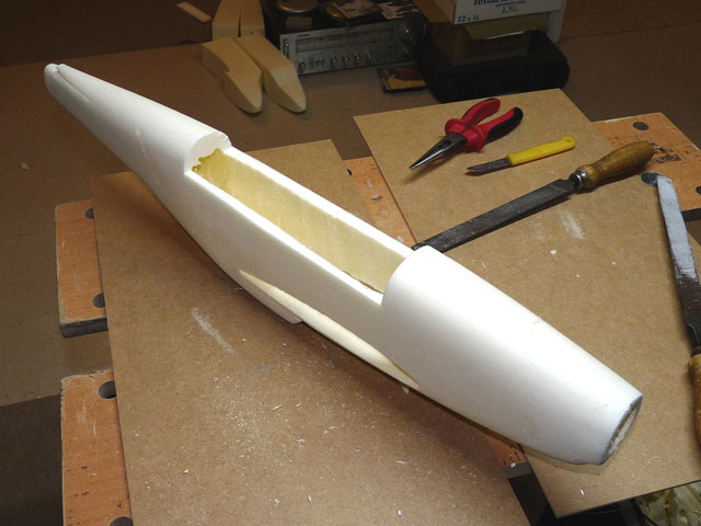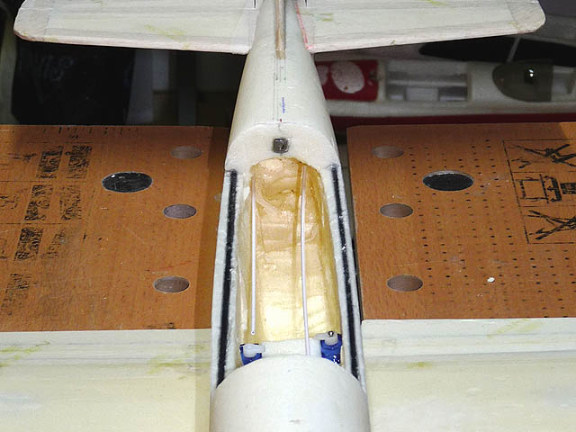 Um den durch die Öffnung der Akkuklappe geschwächten Rumpf wieder zu festigen, werden zwei 3mm-Carbonrohre eingeklebt. Die 2mm-Bowdenzüge wurden mit einem angeschärften 2mm-Federstahldraht durchs Styrodur gebohrt (gut zielen, dann geht das schon...).