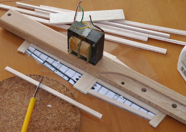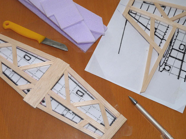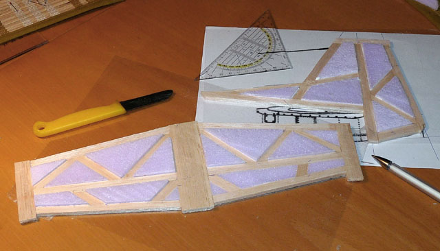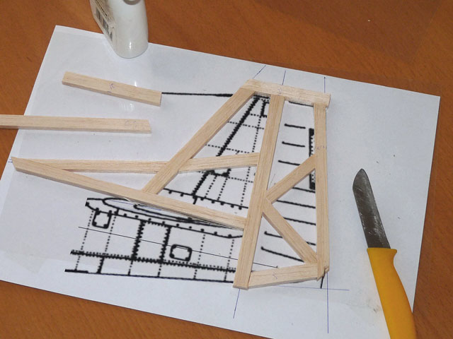 Bei den Leitwerken haben wir uns diesmal für den "Fachwerkbau" entschieden: Sehr aufwändig, aber in Punkto Stabilität und Gewicht wohl das Otpimum. Aus 4,5mm Balsabrettchen werden Streifen zu 3, 1 und 0,8cm geschnitten. Dann kanns losgehen...