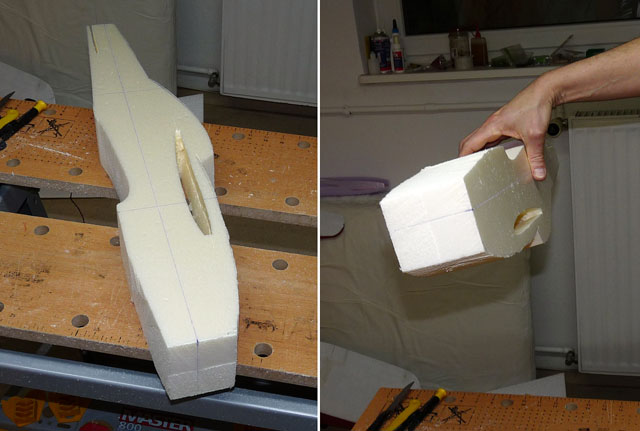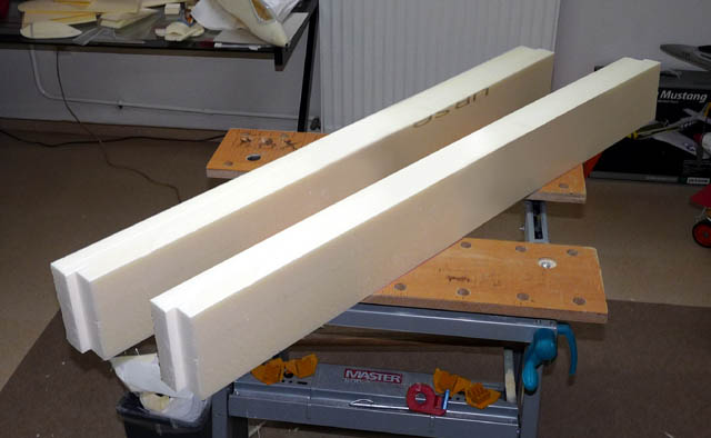Der Anfang: im Baustoffhandel eine Styrodurplatte holen und im Baumarkt auf das Rohmaß des Fliegers sägen lassen. Das sind die Ausgangs-Foam-Blöcke.