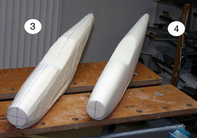 ...den Rumpfkasten mit dem Messer angeschrägen (3) und mit dem Schleifblock verschleifen (4).
