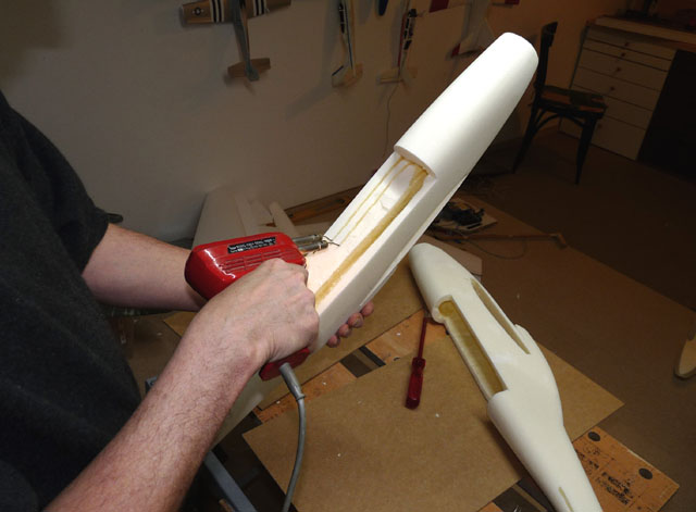 Jetzt gehts ans Aushöhlen: mit einer Lötpistole und einem zeimlich langen Hitzedraht (Kupfer, ca. 0,8mm) wird ein langes Rechteck geformt und dann gehts los. Erst die Mitte, dann nach hinten und nach vorne, soweit es geht und letztlich von vorne das Rundloch für die Motoröffnung.