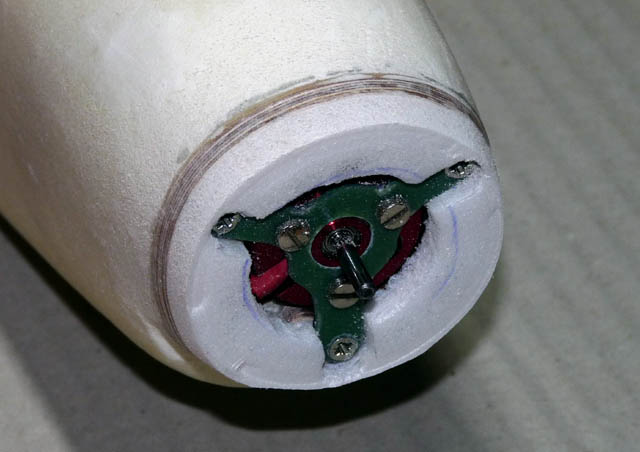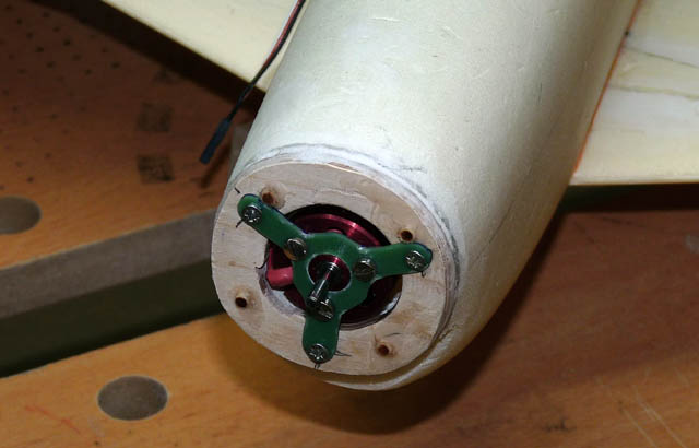Die Motorplatte (4mm Sperrholz) ist aufgeklebt (Epoxy) und mit ca. 8cm langen Schachlikstäbchen in den Rumpf verzapft (Ponal). Nach dem Aushärten werden die Stäbe abgeschnitten - ca. 1...2 mm als "Widerlager" stehen lassen, damit die Motorplatte nicht über die Stäbe "gezerrt" werden kann.