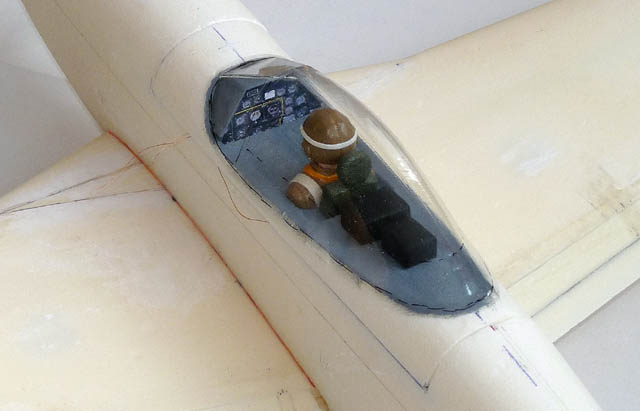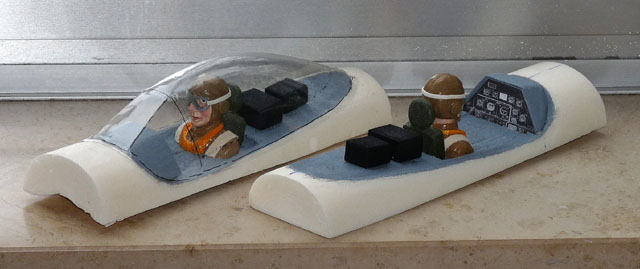 Das Cockpit wird gebaut: die Instrumententafel (aus dem Internet und perspektivisch "gerade" gezogen), der Sitz und die (vermutlich verschließbaren und festgeschraubten) Flugkisten hinter dem Sitz. Alles aus Styrodur geschnitzt.