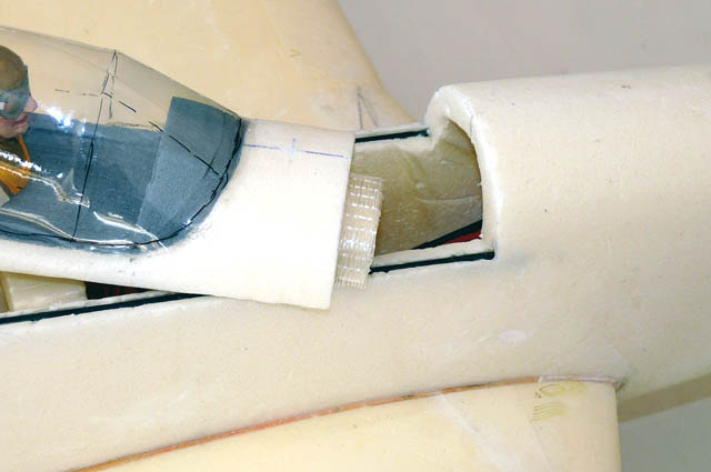 Zum Schluss das i-Tüpfelchen - der Übergang von Fläche zu Rumpf: einen angeschrägten Styrodurstreifen ankleben. Auf der Flächenseite mit Ponal einstreichen (bleibt beweglich) und auf der Rumpfseite mit UHUpor. So kann der Streifen über die Flächen passgenau an den Rumpf geschoben werden und haftet dort sofort fest, während das Ponal langsam aushärtet. Anschließend den Bogen mit der Rundfeile vorformen und verschleifen.
