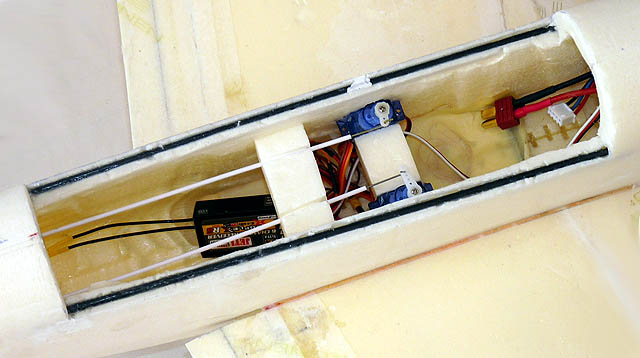 Um den Schwerpunkt besser zu halten, sitzen die Servos für Höhe ud Seite recht weit vorne, stabilisert durch einen Quersteg. Auch die Bowdenzüge werden über einen Quersteg befestigt. Die Quertsege haben gleichzeitig den Vorteil, dass man den Flieger fester anpacken kann und nicht gleich zusammen drückt.
