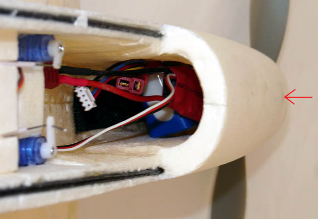 Der GHz-Empfänger dahinter ist noch ein Provisorium. Akku und Regler liegen vorne, hinter dem Motor. Damit sie im Fall des Falles nicht auf den Motor "crashen", ist zwischen Motor und Akku ein Stab von oben nach unten durch den Rumpf geklebt (Pfeil).