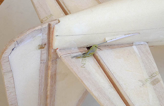 Flächen und Leitwerke müssen müssen rechtwinklig zum Rumpf sein und horizontal zueinander liegen (wir haben Fotos gemacht und am PC vermessen. Wer ein gutes Augenmaß hat, kann das natürlich auch so...). Zuerst die Flächen einpassen - nach ihnen richten sich dann die Leitwerke. Die richtige Position wird angezeichnet, dann wird alles mit Ponal eingeklebt - und? Eine Nacht lang zum Aushärten liegen gelassen.