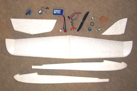 Der komplette Bausatz: zwei Rumpfhälften, zwei Flächenhälften + zwei "Öhrchen", HLW und SLW. Zwei 4g-Servos, ein 2S/500mAh/20C Lipo-Akku, ein 10g-Regler (12A), ein Prop GWS 5043 plus Mitnehmer und ein MZK-Empfänger "Penta" (4,5g inkl. Mini-Quarz).