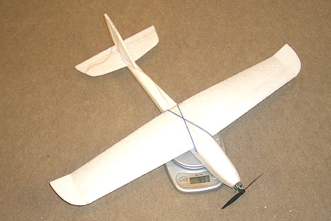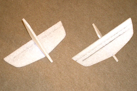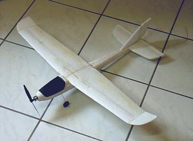 FLächenbau: in die Flächenhälften ein 4er Carbonrohr (Schlitz schneiden) einkleben. Öhrchen mit UHUpor an die Flächenhälften kleben und verschleifen. Dann die Flächenhälften mit einer V-Stellung von ~2° pro Seite (4~5° in der Summe) zusammenkleben. Die Flächenmitte mit einem Reststück des 4er Carbonrohres ein oder zweimal überbrücken. Soll die Fläche abnehmbar und mit Gummi aufgespannt werden, empfiehlt es sich, die Fläche an Nase und Endleiste mit einem Stück Schaschlikstäbchen od ähnl. zusätzlich zu überbrücken (damit sie der Gummizug nicht verbiegt bzw. schneidet).