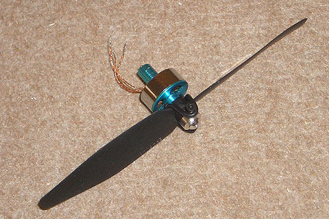 Der Antrieb: ein 10g-Brushless-Motor (z.B. 1811-2000), Mitnehmer und 5043-GWS-Prop (5x4,3). TIPP 1: GWS-Props haben ein 3mm-Loch, Mitnehmer oft 4mm. Dazu den GWS-Prop einfach an der Rückseite mit einem 5er Bohrer etwas ansenken und schon passts (nicht durchbohren - das "eiert" hernach meist). TIPP 2: GWS-Props haben einen sehr guten Wirkunsggrad, brechen aber leider sehr schnell ab! Deshalb die Prop-Blätter erstmal mit einem Tropfen 5-Min-Epoxy an ihrer Wurzel (Vorder- und Rückseite) verstärken und dann hält auch das weit besser.