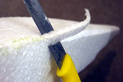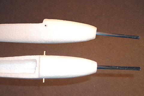 Die beiden Rumpfhälften werden vor dem Verkleben für die Aufnahme der RC-Komponenten innen ausgehöhlt (Heißdraht, mit Messer schneiden oder ausfräsen). Ins Heck wird innen zur Stabilisierung ein halbes Schaschlikstäbchen eingeklebt.