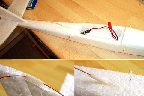 Die Motorkabel werden aus Platz- und Gewichtsgründen direkt auf oder mit dem Regler verlötet (Schrumpfschlauch drüber, damits keinen Kurzschluss geben kann). Platzmäßig wird der Regler vorne im ausgehöhlten Rumpf "verstaut". Hinten kommt der Empfänger rein - die Antenne geht sofort nach oben raus und wird zum Seitenleitwerk abgespannt. Dazu ein kleines Stück Bowdenzugrohr (3mm) durch den Rumpf zum Empfänger und hinten oben am Seitenleitwerk ankleben.