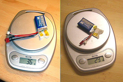Gewicht sparen - Akku umbauen: Aber VORSICHT !! bei versehentlichem Kurzschluss blähen sich die Lipo-Zellen auf und können platzen => das heisst umherfliegende brennende Teile !! Also vorsichtig die Abklebung an den Anschlüssen entfernen (Holz oder Kunststoff, KEIN METALLwerkzeug verwenden!). Dann den schweren und dicken DEAN-Stecker durch einen kleinen JST ersetzen und den Balanceranschluss kürzen. Das spart in diesem Fall a) 7g Gewicht und b) lassen sich die kürzeren Kabel und der kleinere Stecker weit besser im Rumpf unterbringen.