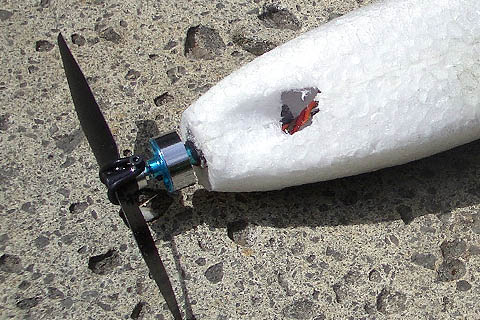 Für die Motorhalterung wird ein 8er Carbonrohr (Innendurchmesser = 6mm) etwa 2 cm tief in den Rumpf geklebt. Das in den Rumpf gesteckte Carbonrohr einfach überstehen lassen => so lässt sich leicht ein Motorsturz von ca. 2° nach unten und ein Seitenzug von ca. 1° nach rechts einstellen. Dann dünnflüssigen Sekundenkleber hineinlaufen lassen und wenn fest, den überstehenden Teil abschneiden (Laubsäge, Dremle-Flex...).