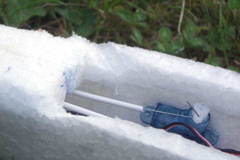 Als Ruderhörner dienen übrig gebliebene Servohebel. Bowdenzüge verlegen: mit einem 2mm Federstahldraht ein Loch durch den Rumpf bohren (hier muss man genau zielen) und 2mm Kunststoffrohr nachschieben. Mit Kleber fixieren. 0,7er Stahldraht als Zug, wer geschickt ist, biegt ihn exkat um - erst an den Rudern, dann am Servo. Ansonsten handelsübliche Fixierungen auf die Servohebel montieren und per Schraube einstellen.