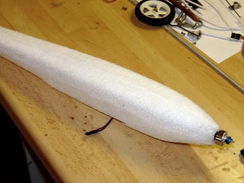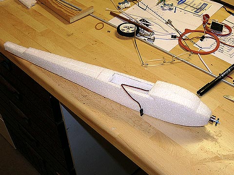Wie beim Prototypen steckt der 10g-Motor in einem 8er-Carbonrohr. Dieses wird in eine ausgefräste Rinne mit etwa 1-2° Neigung zur Rumpfachse (= Motorsturz) geklebt.