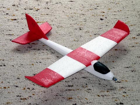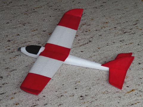 In die Fläche wurde diesmal gleich von unten ein 4er Carbonrohr geklebt - die Festigkeit ist damit nochmal einen Tick besser, als beim Prototypen. Das rot ist übrigens nicht lackiert, sondern ein dünnes vorgefärbtes Bastelpapier, mit einer Ponal-Wasser-Mischung aufgeklebt (ja - es hält auf EPP und verfestigt die Depron-Öhrchen optimal).